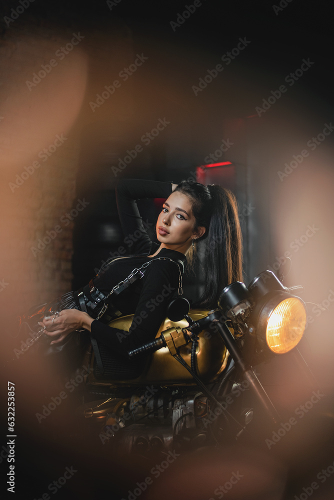 Obraz na płótnie Canvas - Young beautiful girl with dark hair on the old motorbike..