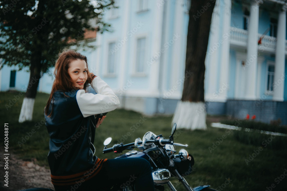 Obraz na płótnie Canvas - long-haired woman motorcyclist on a classic motorcycle..