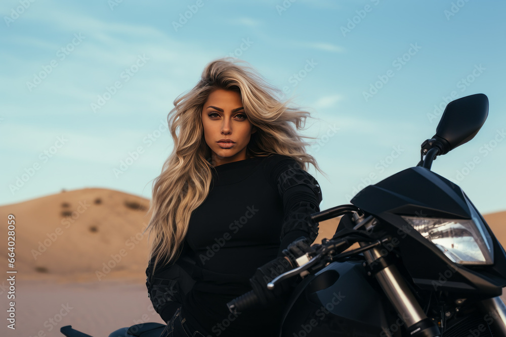 Obraz na płótnie Canvas - Woman with long white hair sitting near cross dirt motorcycle in desert. Girl are resting during off-road tour at hot desert.