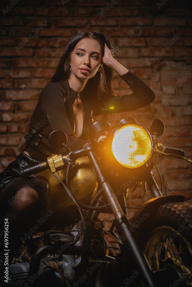 Obraz na płótnie Canvas - Young beautiful girl with dark hair on the old motorbike. Girl motorbiker..