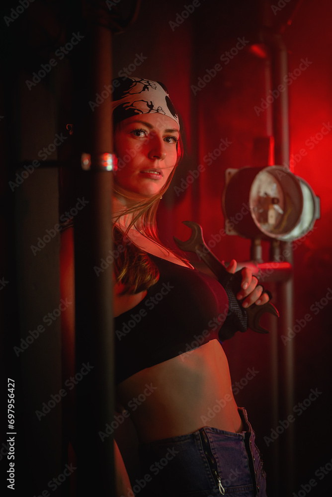 Obraz na płótnie Canvas - Girl with the wrench tool posing in the dark. Mechanic concept..