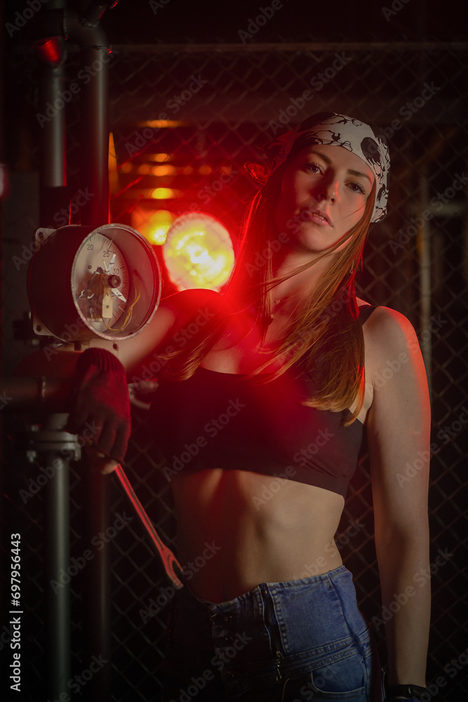 Obraz na płótnie Canvas - Girl with the wrench tool posing in the dark. Mechanic concept..