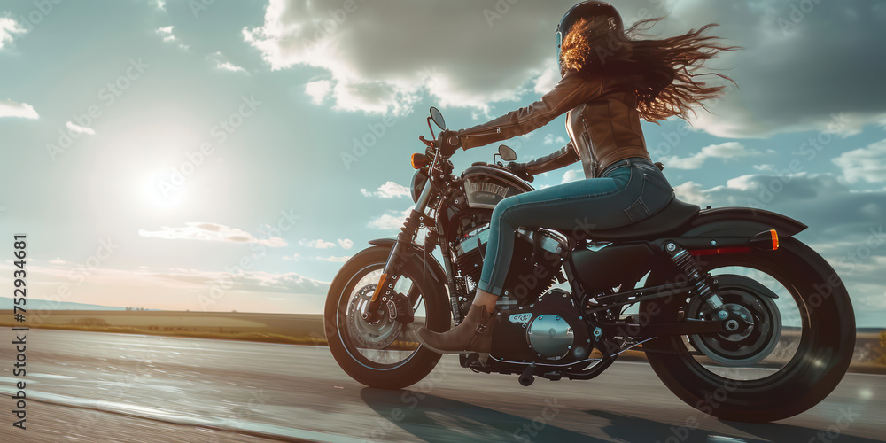 Obraz na płótnie Canvas - A Beautiful woman biker wearing glass with tattoos muscled arms and legs, long hair in the wind, high heel boots, leather jacket, riding a motorcycle.