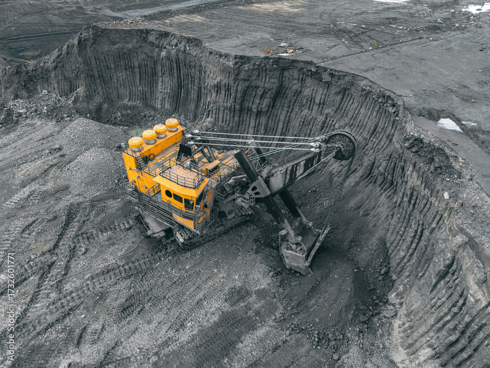 >Obrazy na płótnie Canvas>Wybrane dla Ciebie>Aerial view of open pit mine with industrial excavator in operation, removal overburden soil for new ore deposit development