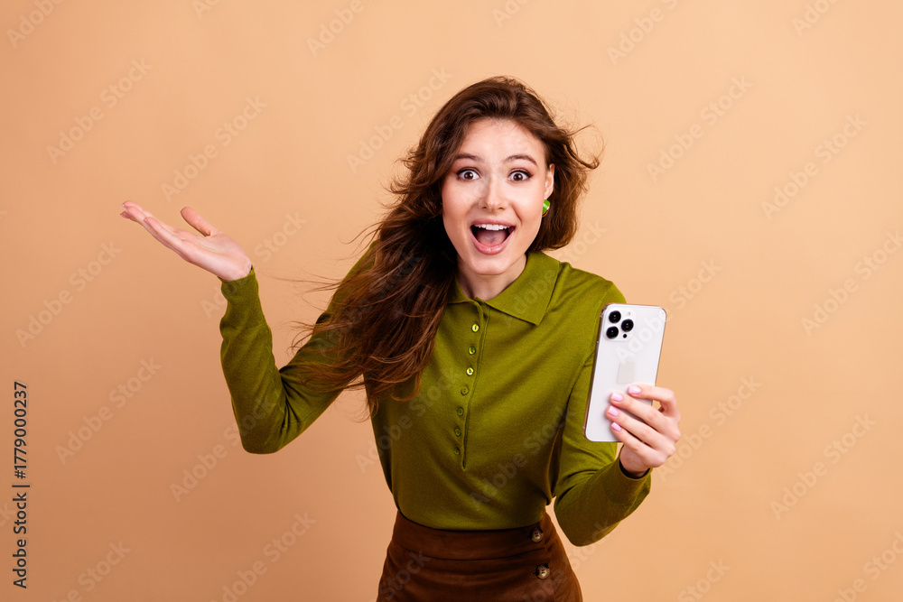 Obraz na płótnie Canvas - Young woman joyful selfie promotion casual fashion style against beige backdrop.