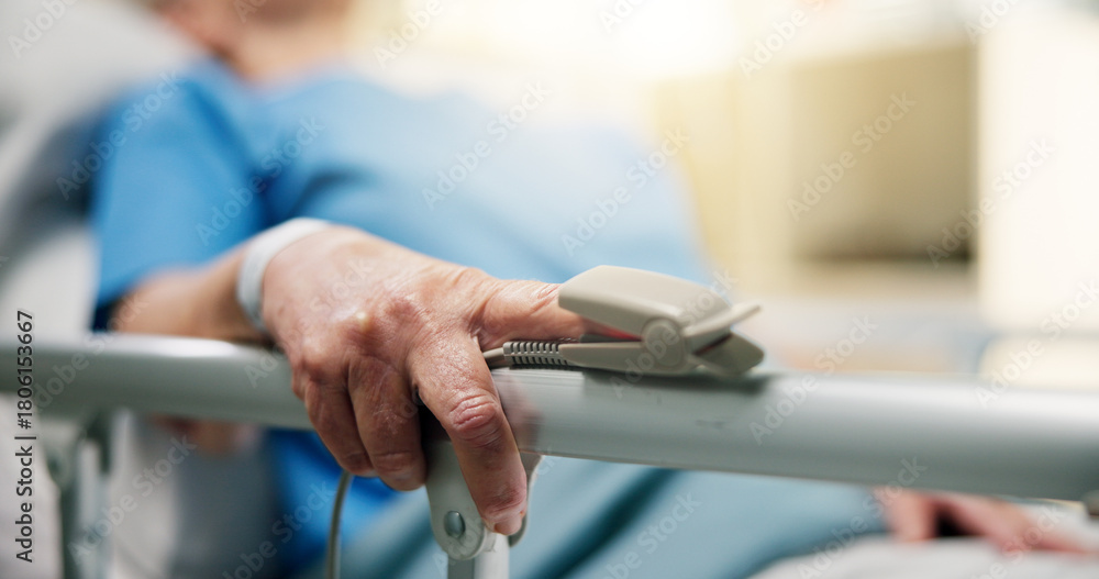 Obraz na płótnie Canvas - Hands, old person and oximeter in hospital bed to monitor pulse, blood pressure and surgery recovery. Closeup, elderly patient and medical machine to track oxygen, chronic condition and critical care.