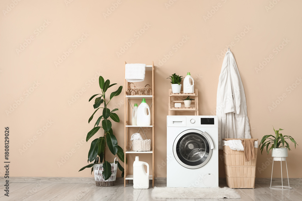 Obraz na płótnie Canvas - Modern washing machine, laundry basket, shelving unit with detergent and ficus houseplant in room.