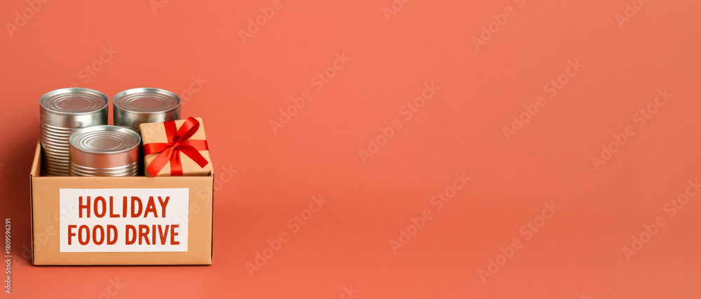 Obraz na płótnie Canvas - Holiday food drive box with canned goods and gift against orange background.