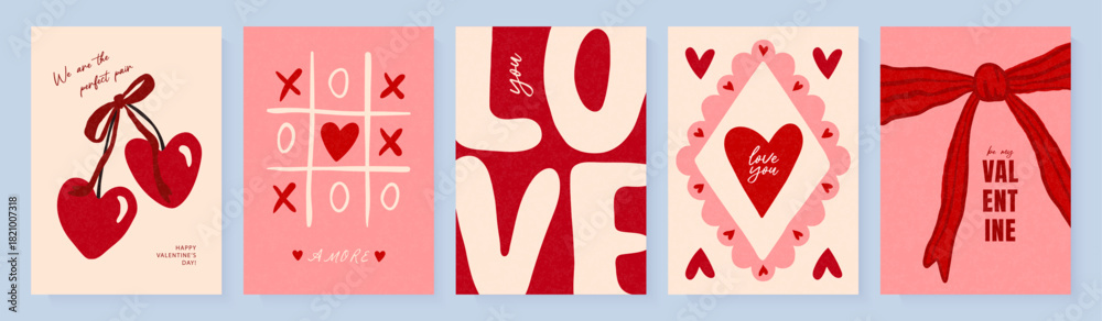 >Obrazy na płótnie Canvas>Wybrane dla Ciebie>Set of Valentine's Day greeting card designs featuring heart-shaped cherries, a bow, and a tic-tac-toe game in a hand-drawn style with a grainy texture for a romantic holiday, vector illustration.