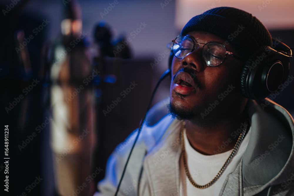 Obraz na płótnie Canvas - A man wearing headphones and a beanie focuses intently while singing into a microphone during a studio session. The scene conveys deep concentration and passion for music creation..