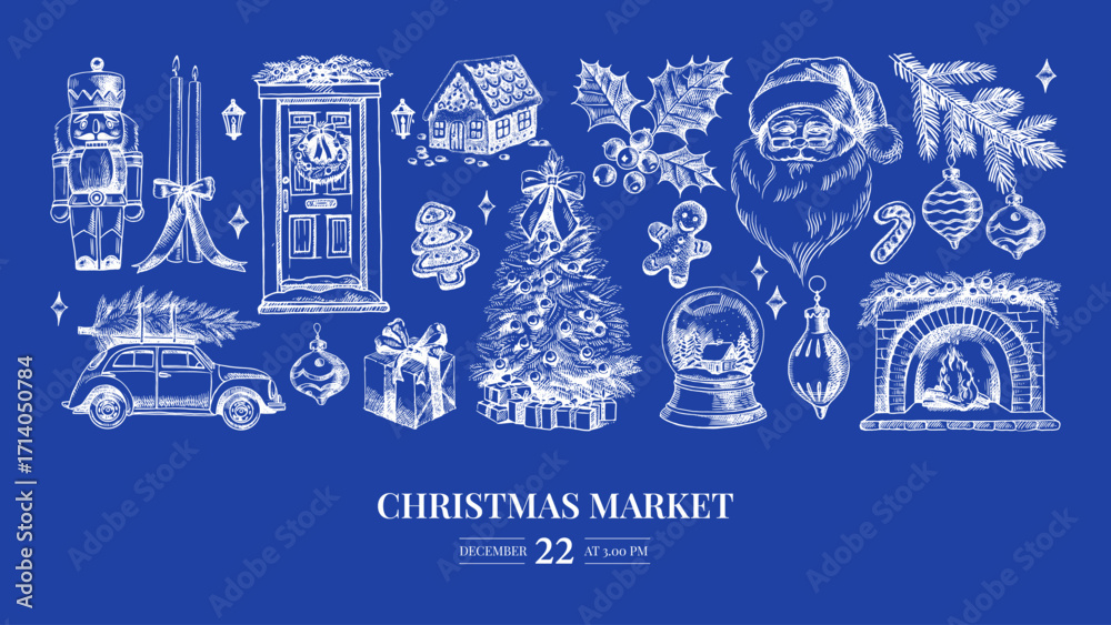 Obraz na płótnie Canvas - Christmas invitation card with hand drawn holiday elements. Festive mood, elegant vintage design. Vector sketch illustration..