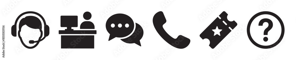 Obraz na płótnie Canvas - Black customer support and helpdesk icon set featuring a call center agent with a headset, chat bubbles, telephone, event ticket, and a question mark symbol for assistance.