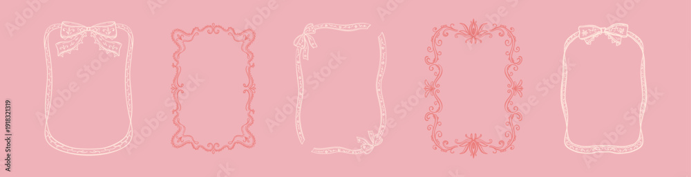 Obraz na płótnie Canvas - Hand drawn doodle feminine coquette pink vintage lace rectangle frames with cute ribbon bow. Victorian, baroque, rococo antique style filigree frill embroidery line art crayon sketch minimalist border.