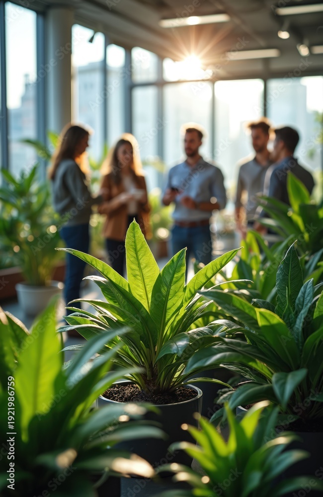 Obraz na płótnie Canvas - Employees in modern office with plants discuss business. Colleagues network near green plants. Natural light enters large windows. Teamwork and sustainability concept..