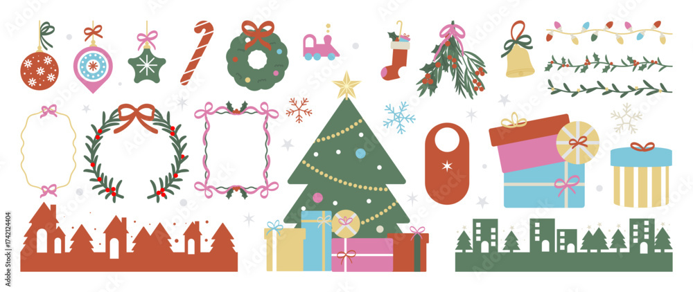 Obraz na płótnie Canvas - Christmas ornament and frame vector illustration set. Collection of christmas tree, bauble, gift, wreath, leaves, screen, snowflake, candy cane. Design for sticker, card, poster, invitation, greeting..