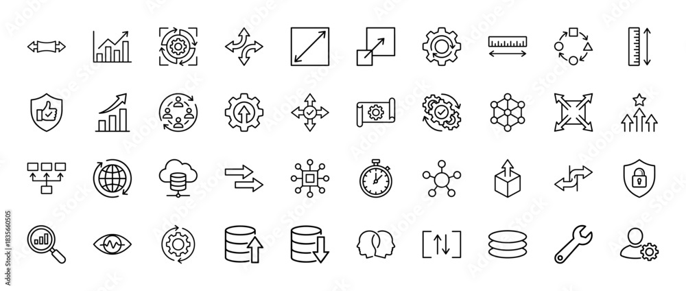 Obraz na płótnie Canvas - Business and technology line icon set. Vector pictograms of growth charts, gears, data security, and development arrows, thin outline illustration..