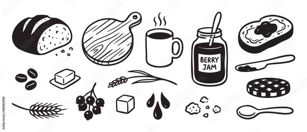 Obraz na płótnie Canvas - Hand drawn black and white breakfast food illustrations featuring bread, berry jam, a coffee mug, butter, toast, and a cutting board in a simple doodle sketch style collection.