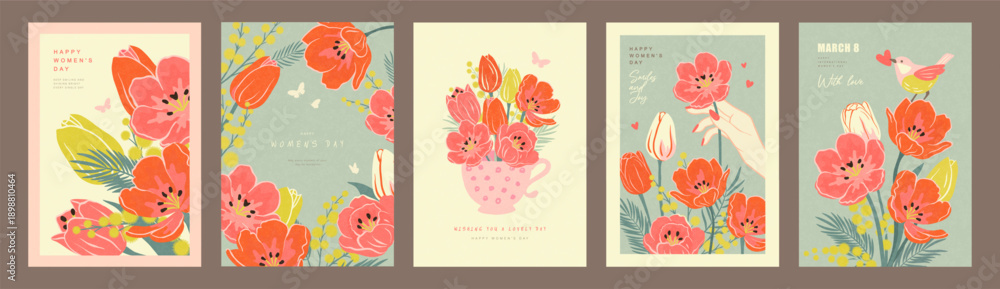 Obraz na płótnie Canvas - Set of Women's Day greeting card designs with hand drawn spring flowers in a soft pastel palette and grainy texture, for holiday greetings and female stationery, vector illustration..