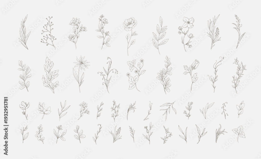 Obraz na płótnie Canvas - Set of hand drawn flowers and plants. Minimalist forms with elegant botanical elements for invitation, save the date card. Botanical rustic trendy greenery vector illustration.