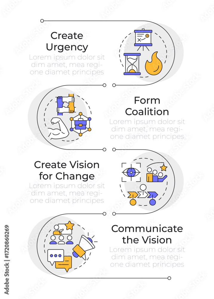 Obraz na płótnie Canvas - Kotter change management model rectangle infographic vector. Organizational innovations provide. Visualization infochart with 4 steps. Circles workflow. Montserrat SemiBold, Lato Regular fonts used.