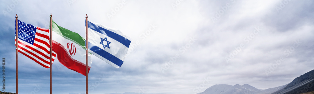 Obraz na płótnie Canvas - National flags of USA, Iran, and Israel waving side-by-side against an overcast sky and mountain background. Dramatic composition with wide copy space for political or global themes.