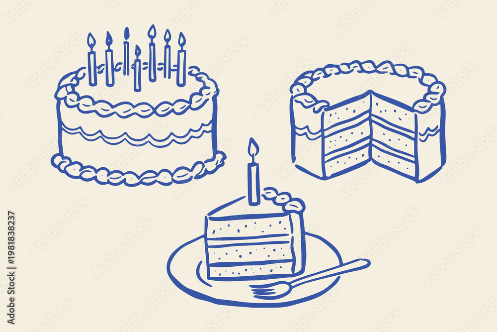 Obraz na płótnie Canvas - Birthday cakes and slice naive doodle vector illustration.