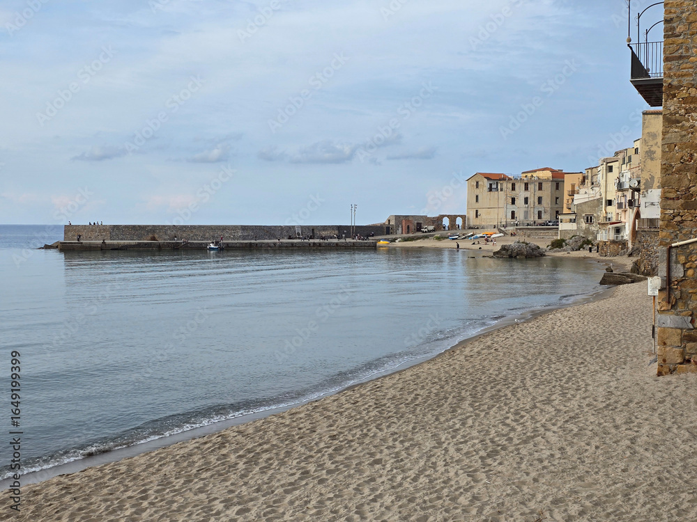Obraz na płótnie Canvas - Sandy Beach with Stone Breakwater and Coastal Buildings.