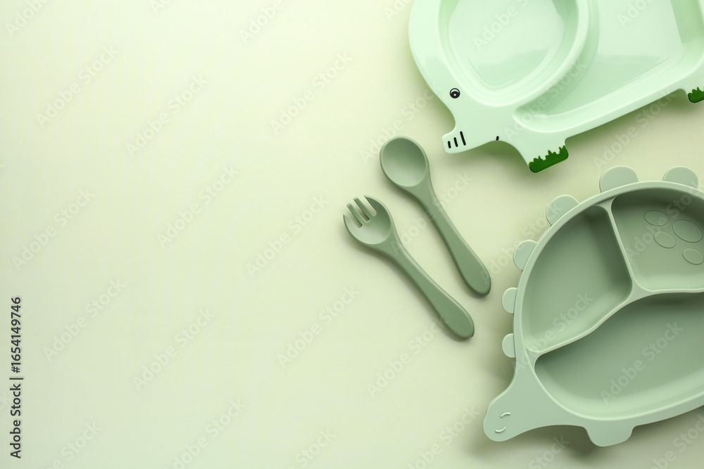 Obraz na płótnie Canvas - Mint green animal-shaped kids plates on pastel background.