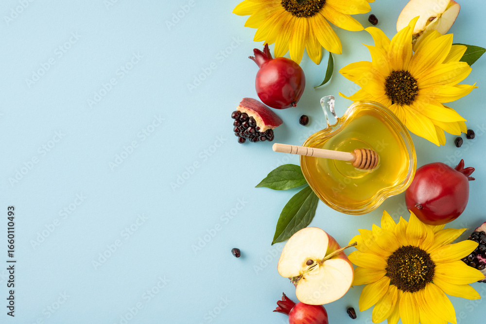 Obraz na płótnie Canvas - Colorful composition of honey, pomegranates, sunflowers, apples, and leaves symbolizing Rosh Hashanah.