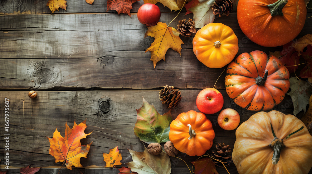 Obraz na płótnie Canvas - Happy Thanksgiving holiday background from autumn leaves, pumpkins and fall decorations on turquoise table..