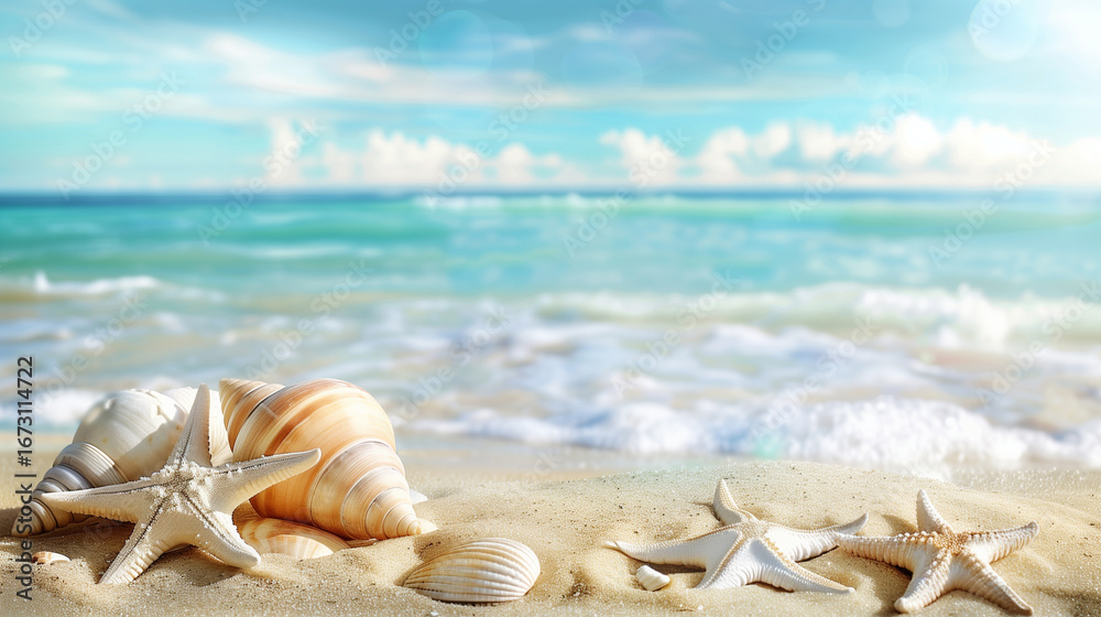 Obraz na płótnie Canvas - starfish and seashell on the summer beach in sea water..