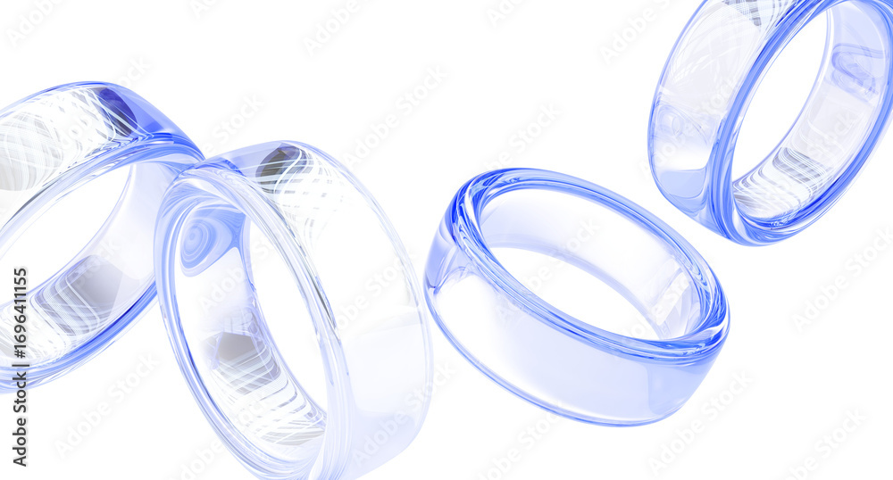 Obraz na płótnie Canvas - Abstract 3d background with glass liquid transparent circle rings flying in air. Water geometric shapes with blue light refraction gradient. Render crystal or plastic falling objects.