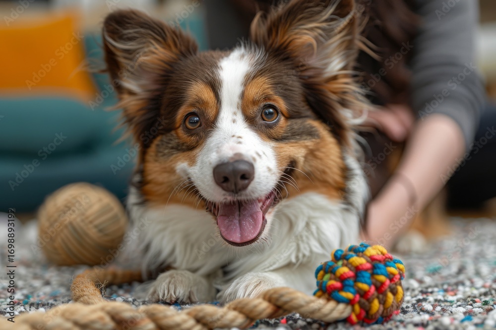 Obraz na płótnie Canvas - Happy dog playing with toys indoors during a cozy afternoon at home with family members nearby.