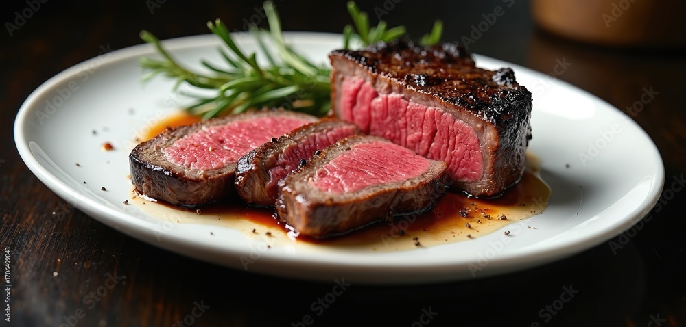 >Obrazy na płótnie Canvas>Wybrane motywy - zobacz więcej !>Góry>Perfectly plated, juicy ribeye steak, medium-rare cooked, served with savory sauce, rosemary sprig on white plate. Delicious beef meal, gourmet dinner, epicurean lunch. Rich texture, appealing