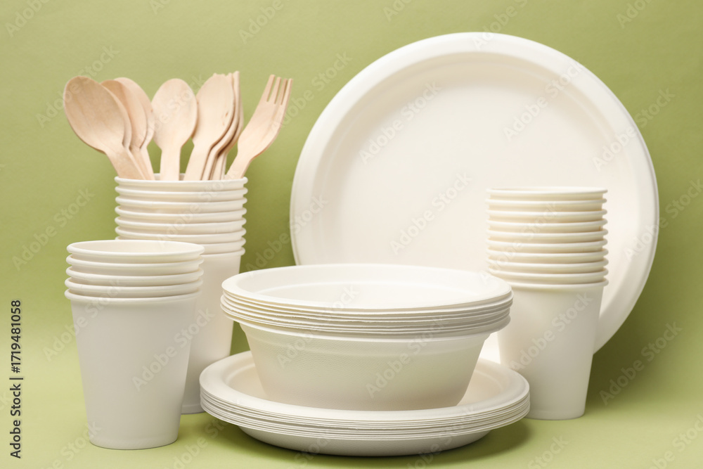 Obraz na płótnie Canvas - Set of disposable tableware on green background.