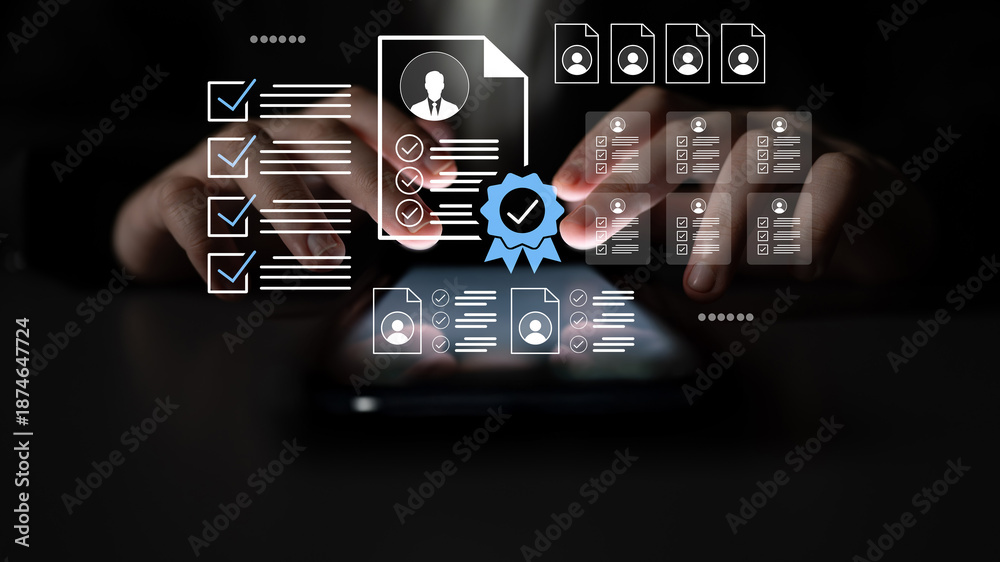 Obraz na płótnie Canvas - Focused hands typing on a tablet, surrounded by digital icons representing documents, checklists, and verification symbols, illustrating modern digital workflows. Gantry.