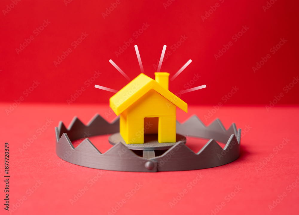 Obraz na płótnie Canvas - A yellow house like bait in a trap. Risky home buying during times of instability. Real estate warning, market volatility and false affordability..