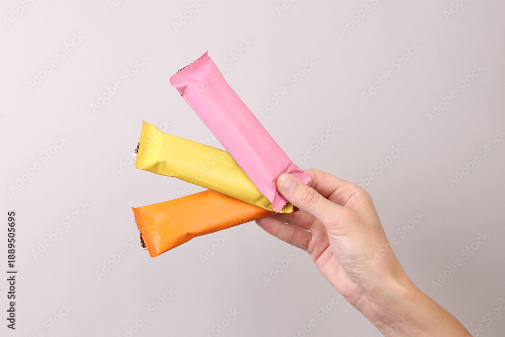 Obraz na płótnie Canvas - Hand holding Chocolate bar packs mockup on gray background. Blank colored candy wrappers.