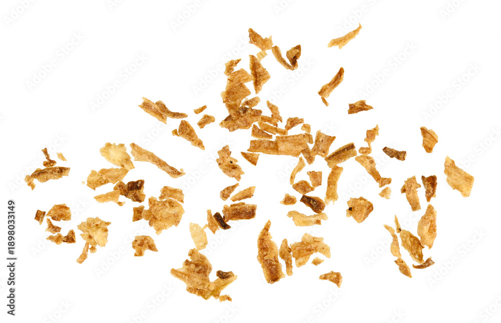 Obraz na płótnie Canvas - Scattered crispy fried onions isolated on a transparent background. Full depth of field. Top view. PNG. .