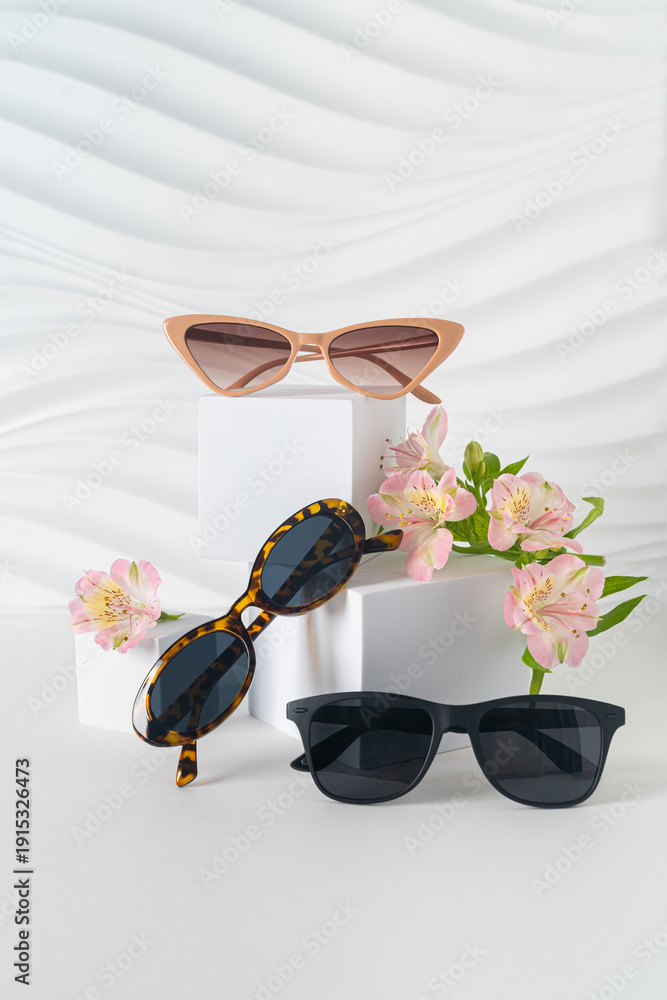 >Obrazy na płótnie Canvas>Wybrane motywy - zobacz więcej !>Góry>Trendy sunglasses in plastic frames on white background with flowers. Sunglasses special offer, summer sale, discount. Optic shop promotion banner. Eyewear fashion. vertical, copy space, minimalism