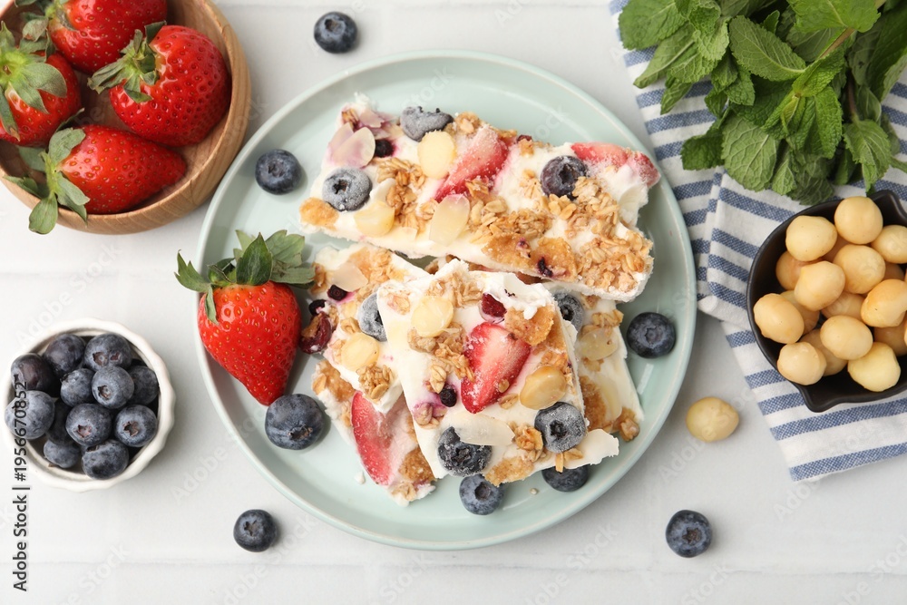 Obraz na płótnie Canvas - Pieces of tasty yogurt bark with berries, almond flakes and granola on light tiled table, flat lay.