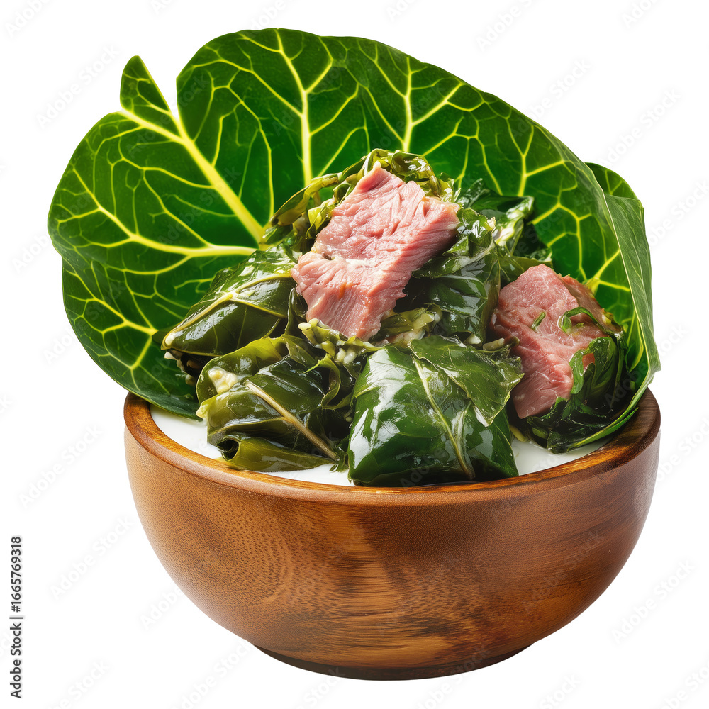 Obraz na płótnie Canvas - Lu Pulu corned beef cooked in coconut milk in taro leaves in wooden bowl, isolated on white transparent background, concept of traditional Polynesian food.