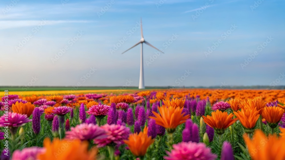 Obraz na płótnie Canvas - Vibrant flower field colorful blossom orange petals pink petals purple spikes green leaves wind turbine blue sky serenity.