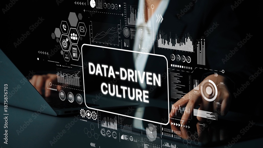 Obraz na płótnie Canvas - Business Professional Engaging with Data-Driven Culture Concept Displayed on Screen for Innovation and Analytics in Modern Workplace. Asymptotic smart data analytic..