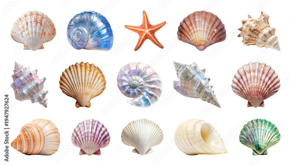 Obraz na płótnie Canvas - PNG Colorful seashells and starfish collection on transparent background.