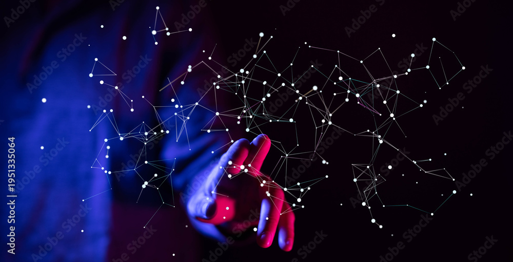 Obraz na płótnie Canvas - Abstract futuristic image of a hand touching a network of connected nodes representing data communication and the futur.