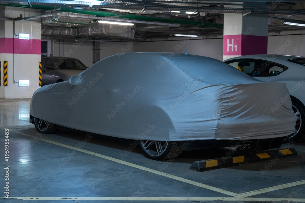 Obraz na płótnie Canvas - Mysterious luxury car, concealed beneath light grey protective cover, securely parked in dimly lit, modern underground garage with concrete pillars and visible utilities.