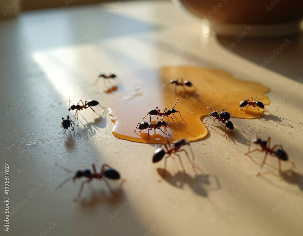 Obraz na płótnie Canvas - Ants swarm sugary liquid spilled on kitchen table surface. Tiny insects gather to feed on sweet fluid. Household pest infestation requires cleanup and prevention..