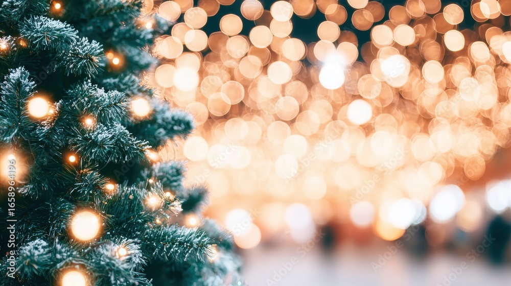 Obraz na płótnie Canvas - Brightly lit Christmas tree with bokeh lights creating a festive atmosphere.