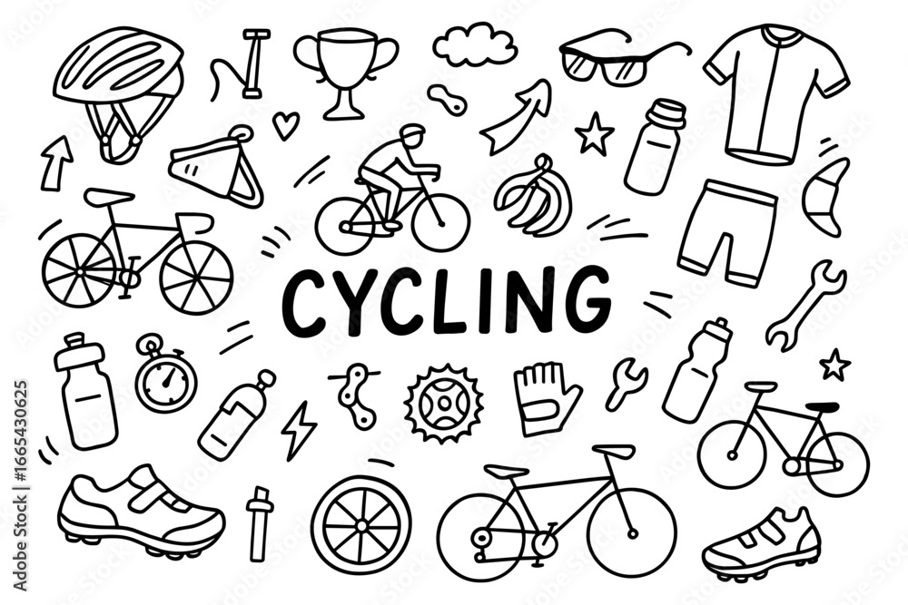 Obraz na płótnie Canvas - Cycling doodle compilation: bikes, gear, and accessories for cyclists.